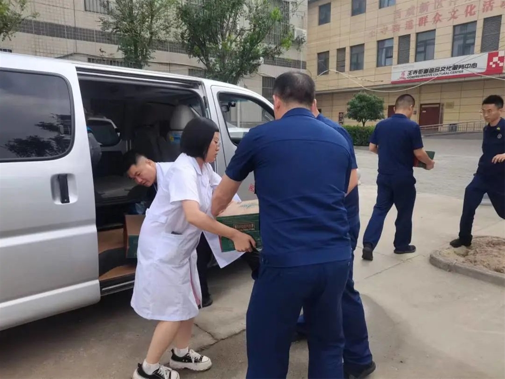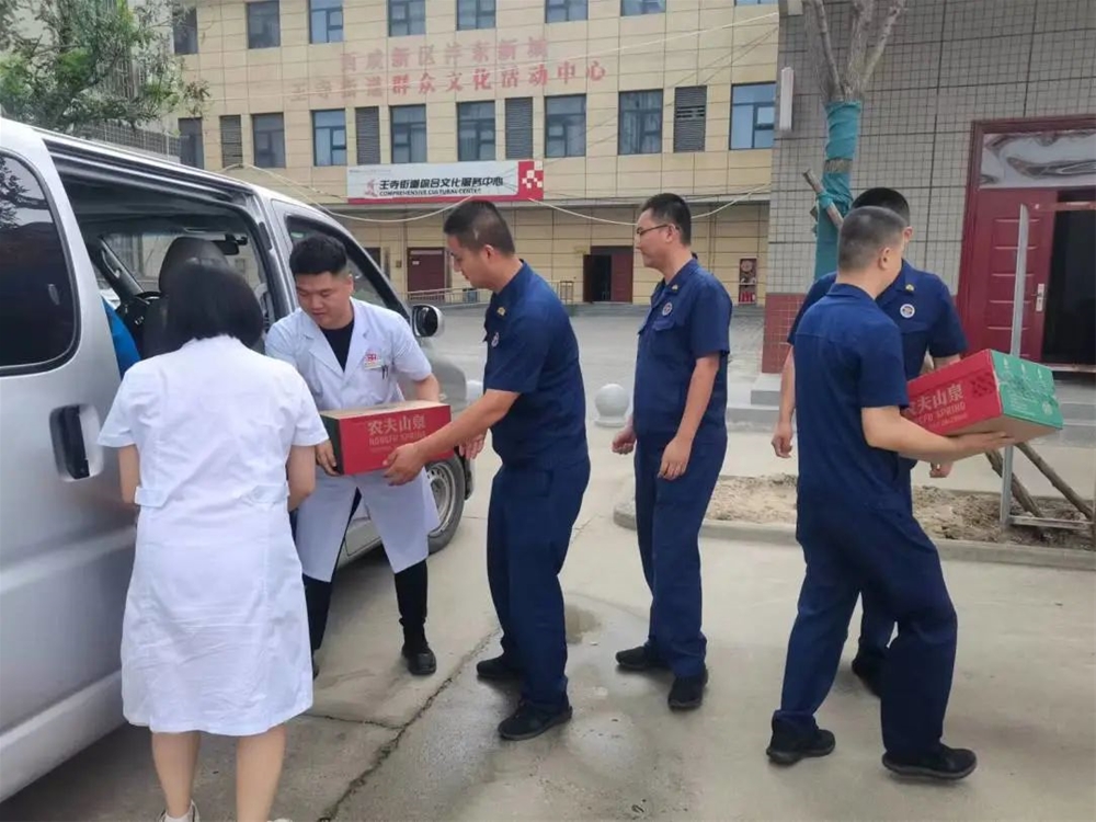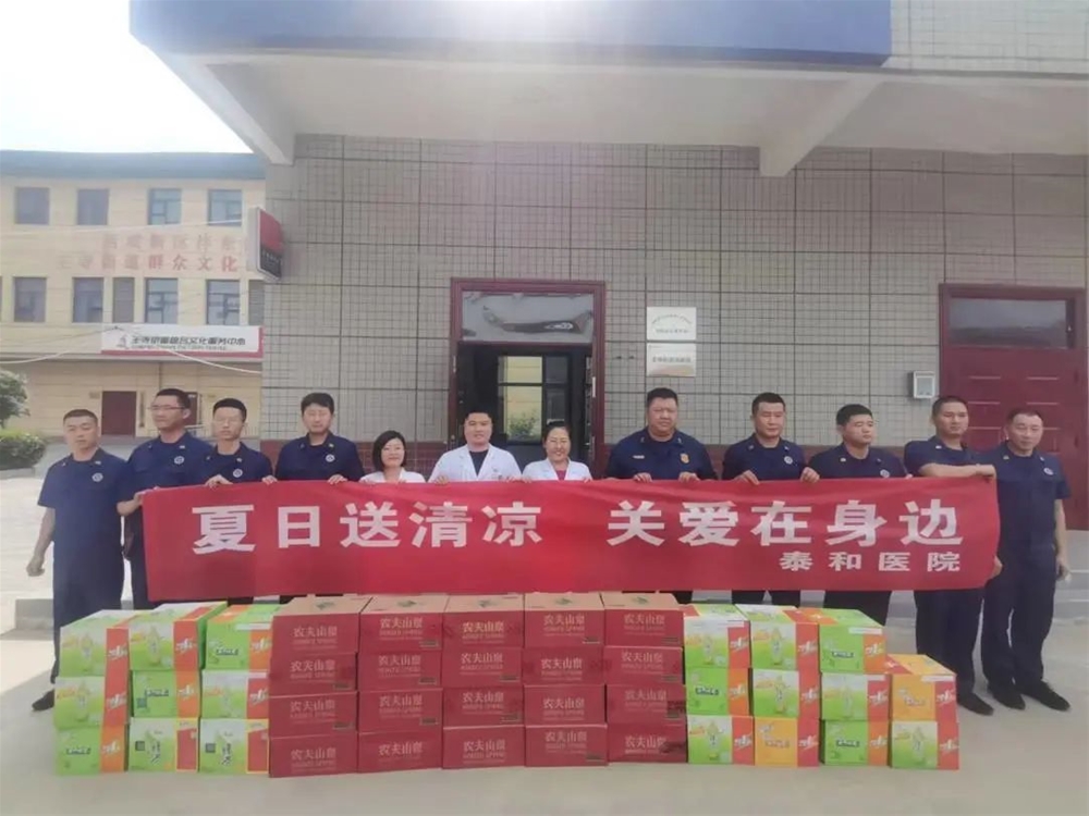 为确保群众生命财产安全,消防队员冒着酷暑奋战在一线,扎实工作,无私奉献,为经济发展和社会稳定做出了积极的贡献。在"八一"建军节之际,作为与王寺消防所党建联合单位的泰和医院开展"迎八一、献爱心"夏日送清凉活动,为沣东王寺消防所送来节日慰问。